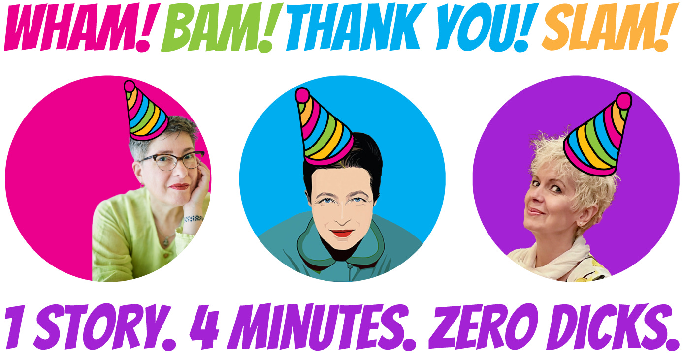 Heads up: You gotta be an annual paid subscriber to be an audience member OR you can purchase a ticket for any slam you want to attend. Remember, our storytellers are women, trans and cis, and non-binary folx. Our audience can be anyone, if you’re well-behaved and respectful. Zoom bombers, beware. Nan’s love for the “remove” button in Zoom is legendary, and she won’t hesitate to use it, so be good!