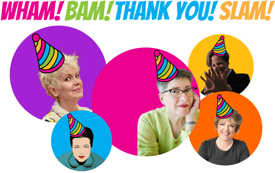 First, meet the delightful and dangerous divas of dish, Nan Tepper and Eileen Dougharty. Our beloved muse and matron saint of feminism, Slamone de Beauvoir. She’s a little unreliable, but even when she’s MIA, her spirit fills our hearts and minds. And then there’s our Zoomarella aka Mel Moseley. And our media maven, Jeanne Vitale, who puts the finishing touches on the storyteller videos.