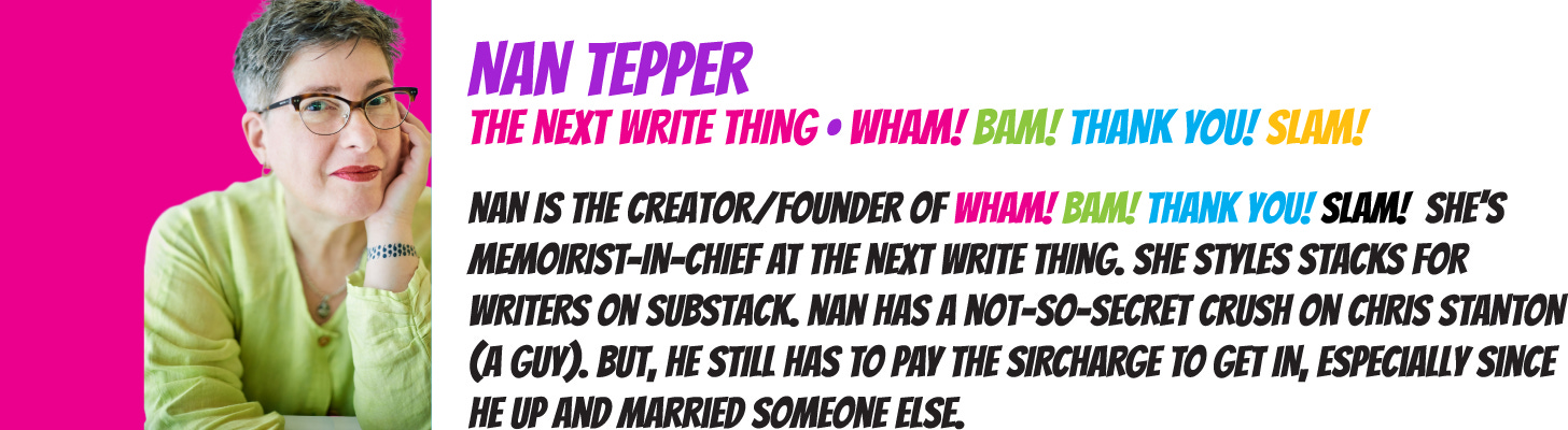 Help this project grow by spreading the word. There’s more than one way to support Wham! Bam! Thank You! Slam! You can buy a ticket to a show or become a paid subscriber (you get in to the live show for free). You can sign up to tell a story.
