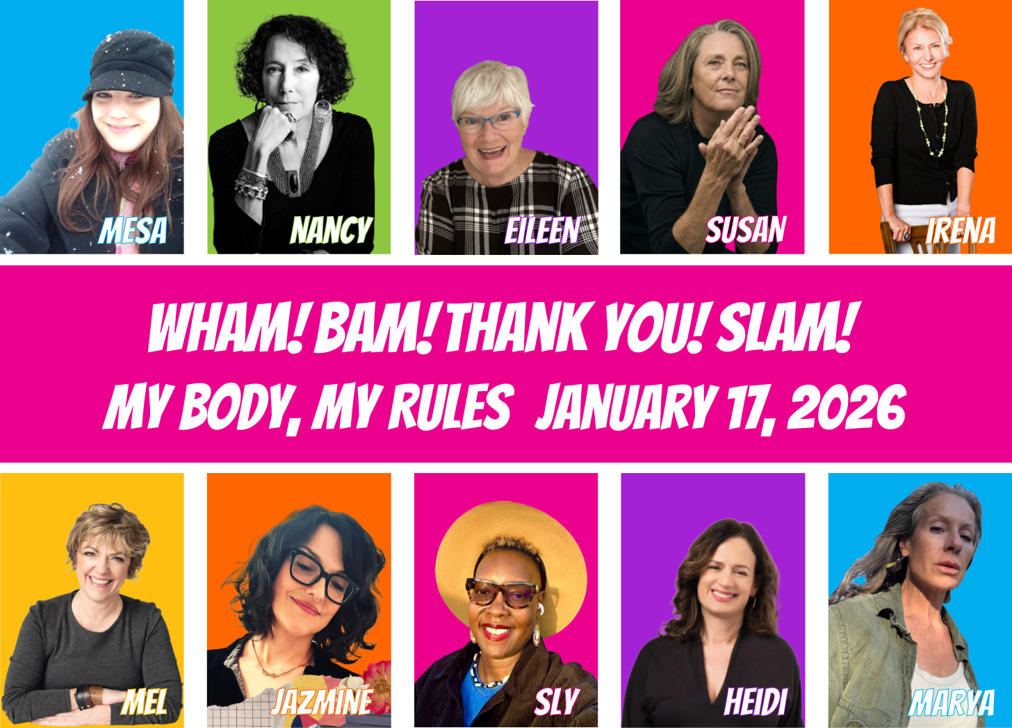 It’s time for us to get down to business. The business of being free to determine what we do with our own bodies and what gets DONE to our bodies, before that right was so jarringly stolen from us. Our bodies belong to us. Only we can say how they’re treated. That’s the theme of our slam this month.