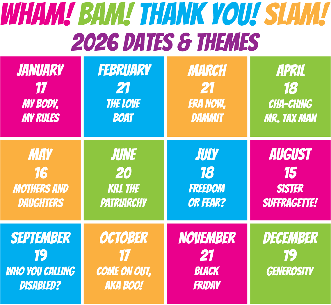 Write the story, and join us for the slam. First come, first scheduled. Limit of 10 storytellers per show. There will be a waitlist started for each slam.