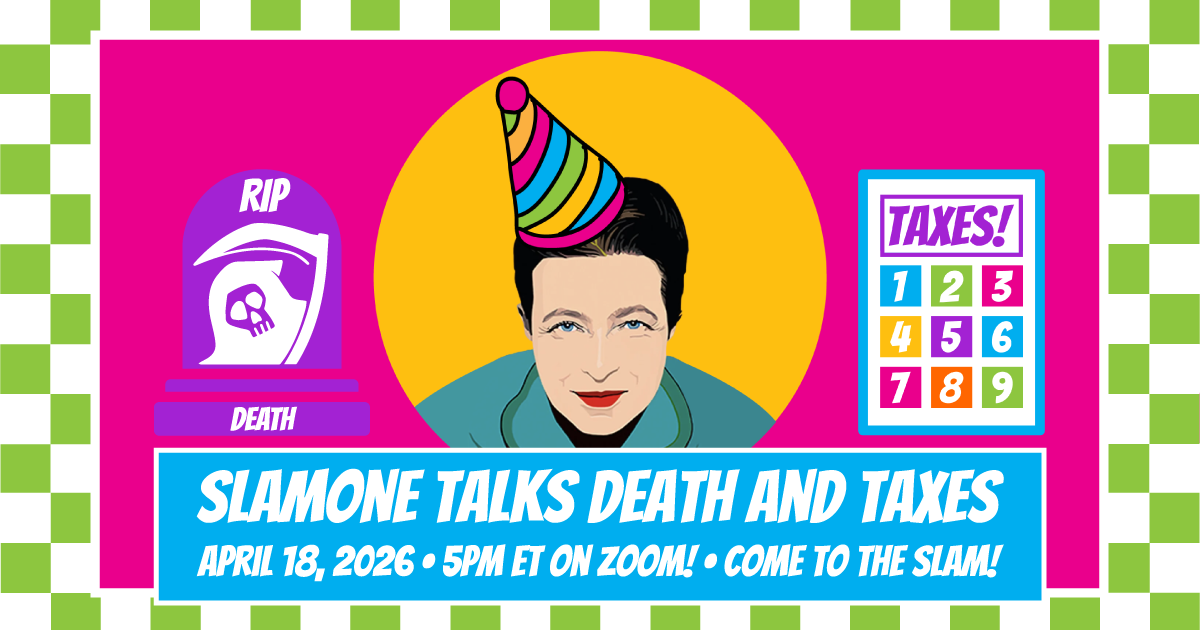 Instead of the “buy, borrow, die” strategy to avoid capital gains where the elite invest in appreciating assets and borrow against them to keep themselves in diamond-crusted pickle forks, Slamone proposes they skip to the end and just die. Or as Abigail Thomas suggested at our last slam, let’s bury them up to their necks in the desert and let the ants eat their faces. Quelle soirée!!!